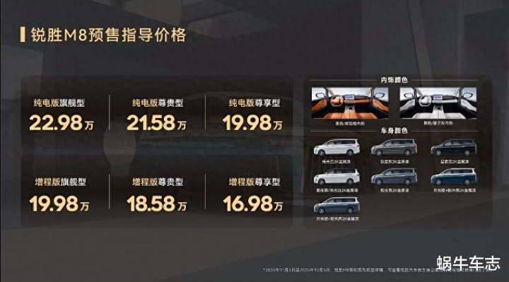 除了以上四台MPV,还有一台比较小众的锐胜M8,这是北京汽车制造厂专为MPV打造的品牌,它定位为中大型MPV,有增程与纯电双动力版本,预售价分别为16.98万元与19.98万元起,大空间与务实定价会是它的主打卖点,近期也将上市。
