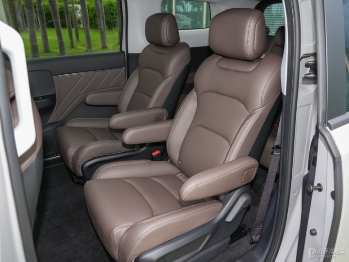 座椅布局为2+2+3七座形式,前排可180°放平,二排配备独立扶手与滑轨,三排支持4/6比例放倒,靠背最大调节角度达127°。
